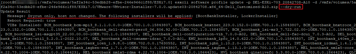 esxcli software profile update -p DEL-ESXi-703_20842708-A10 -d /vmfs/volumes/5af2a34c-53edbb28-efbe-246e966c1f88/ESXi7.0/VMware-VMvisor-Installer-7.0.0.update03-20842708.x86_64-Dell_Customized-A10.zip --dry-run