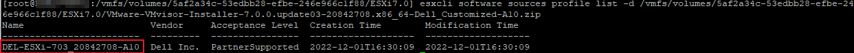 esxcli software sources profile list -d /vmfs/volumes/5af2a34c-53edbb28-efbe-246e966c1f88/ESXi7.0/VMware-VMvisor-Installer-7.0.0.update03-20842708.x86_64-Dell_Customized-A10.zip