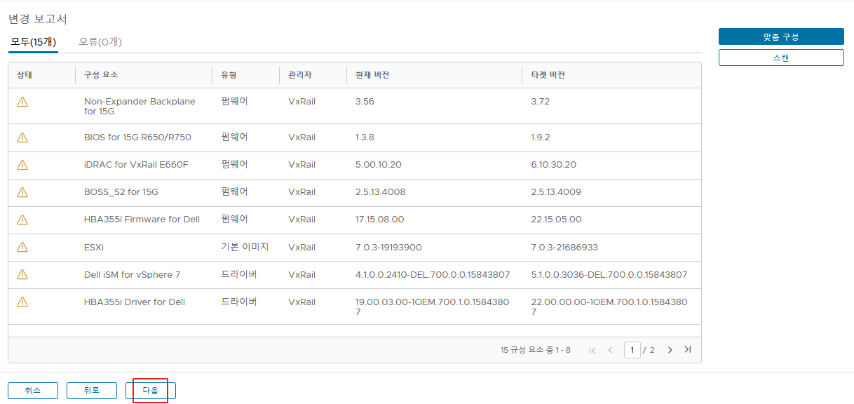 경고가 하나 발생했지만, 외부 vCenter 사용에 따라 발생하는 경고로 무시하고 지나갑니다. (영향 X)