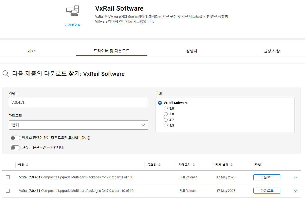 업데이트 패키지 파일 다운로드 - Dell VxRail Software 센터에서 대상 버전의 패키지 파일 다운로드