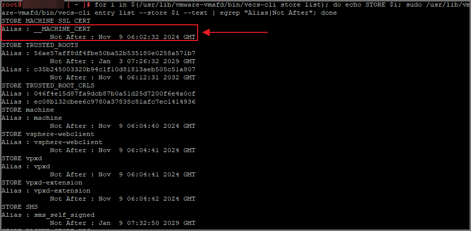 for i in $(/usr/lib/vmware-vmafd/bin/vecs-cli store list); do echo STORE $i; sudo /usr/lib/vmware-vmafd/bin/vecs-cli entry list --store $i --text | egrep "Alias|Not After"; done