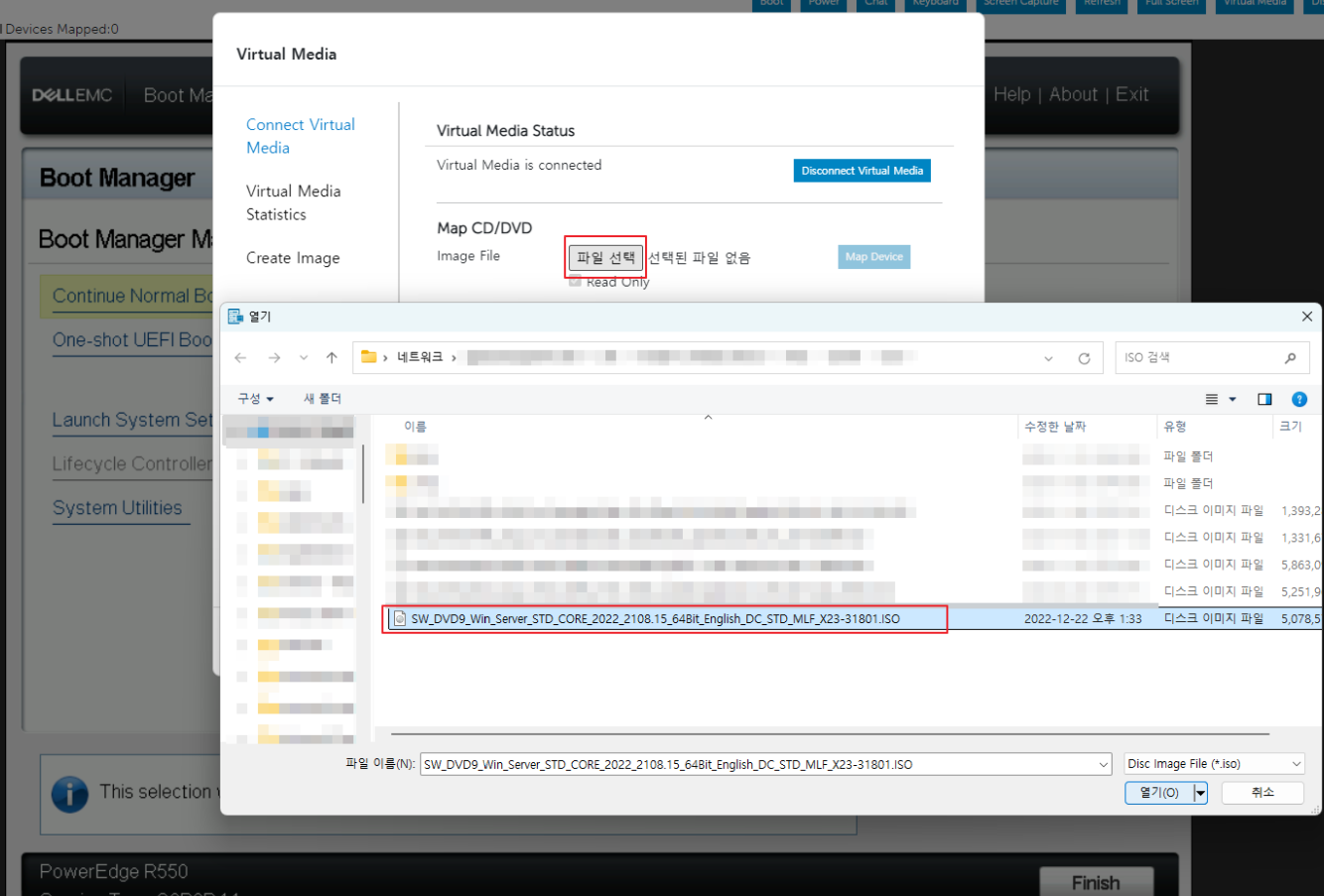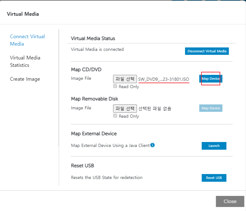 '파일 선택' > .iso 파일 지정 > 'Map Device'