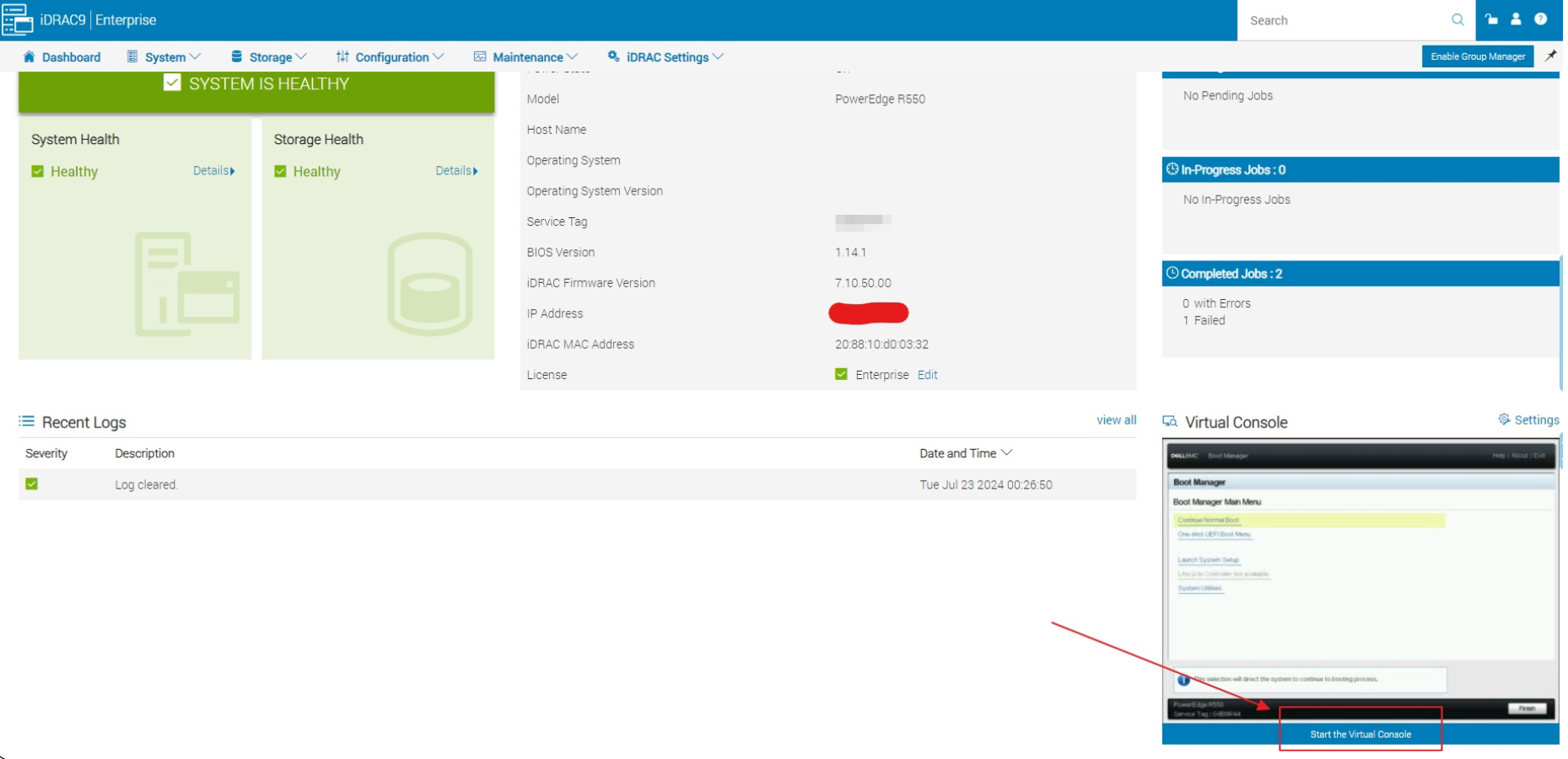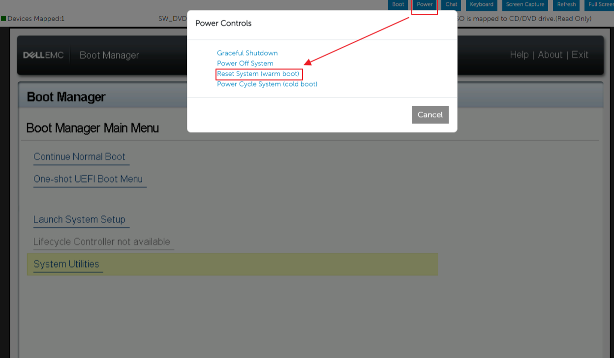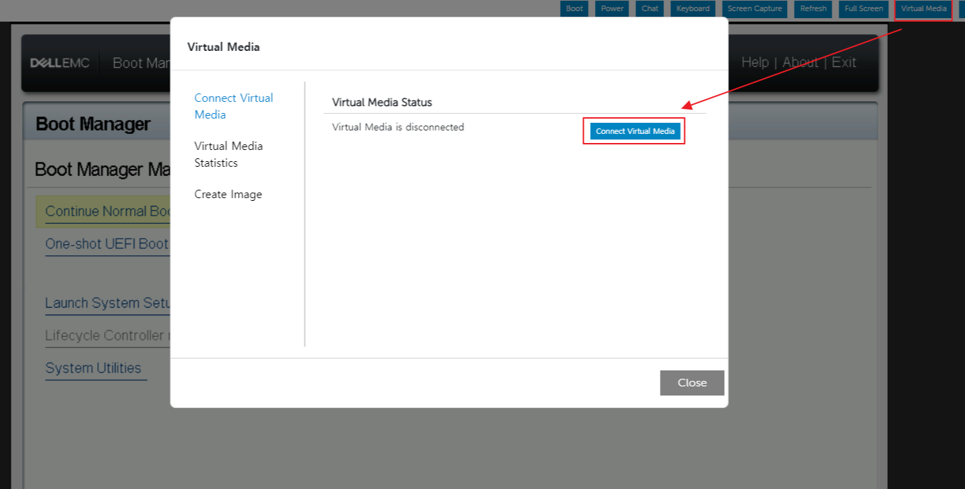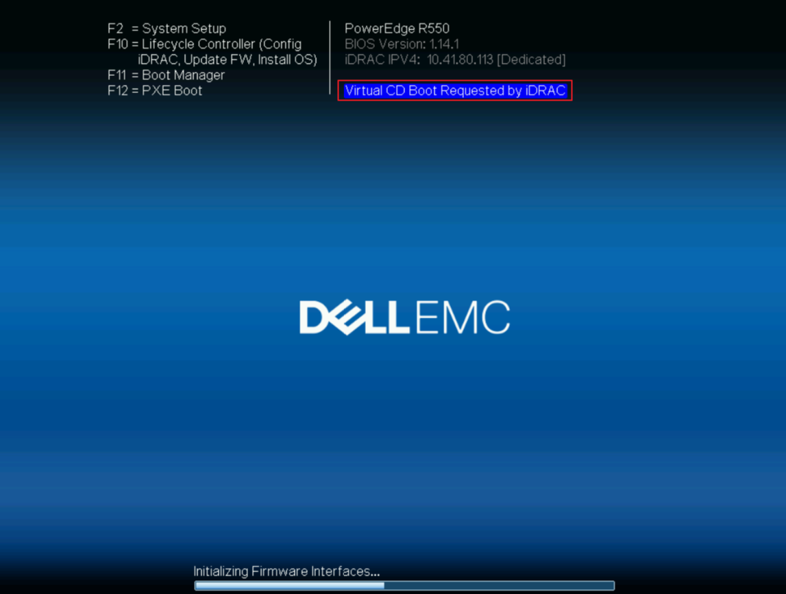 부팅 중, 'Virtual CD Boot Requested by iDRAC' 표시